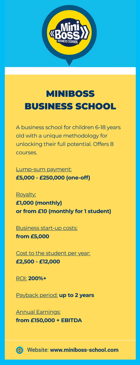 The MINIBOSS & BIGBOSS BUSINESS SCHOOLS franchise system is a unique global network dedicated to the education of future entrepreneurs, innovators, and business leaders. As the founder of the children’s business education market, MINIBOSS BUSINESS SCHOOL has set the standard for early entrepreneurial education, with a structured and scientifically developed methodology that continues at BIGBOSS BUSINESS SCHOOL for young adults.