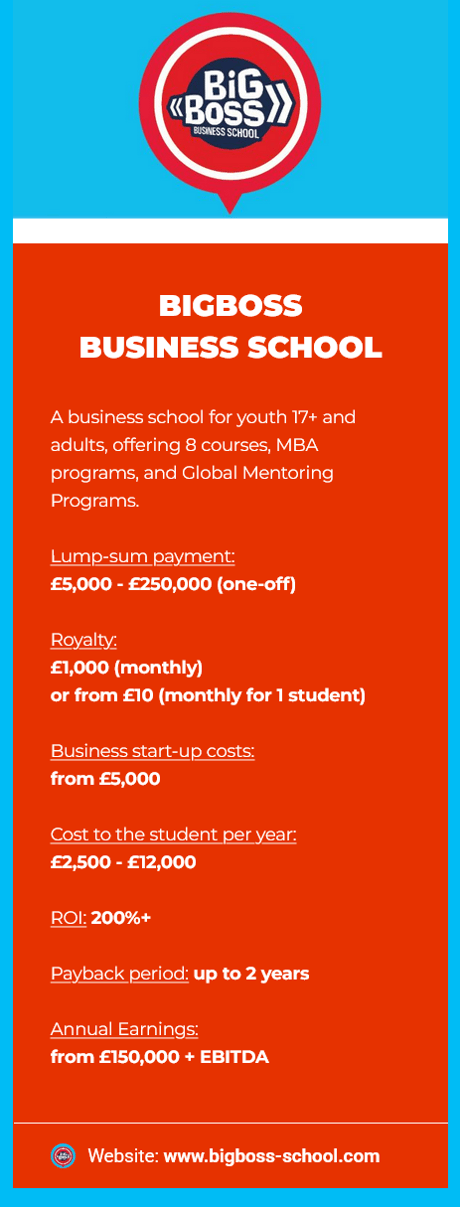 A business school for children aged 6 to 17, designed to help them discover and monetise their talents. It prepares students to become independent entrepreneurs, top-level executives, or heirs to existing family businesses. The system is based on an eight-year educational cycle, with further studies continuing at BIGBOSS BUSINESS SCHOOL.
